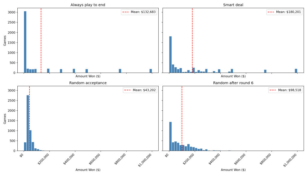 The takeaway: if you take any deal before round 6, you’re almost certainly leaving money on the table, statistically speaking. But “statistically speaking” and “with $200,000 on the line and a studio audience watching” are very different things.