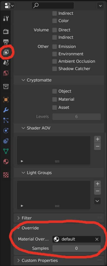 Next, go to the View Layer tab in properties on the right. Scroll to the bottom and expand “Override”. Set the material override to the default material. You can also change the samples. If you keep as 0, it will use the scene render samples.