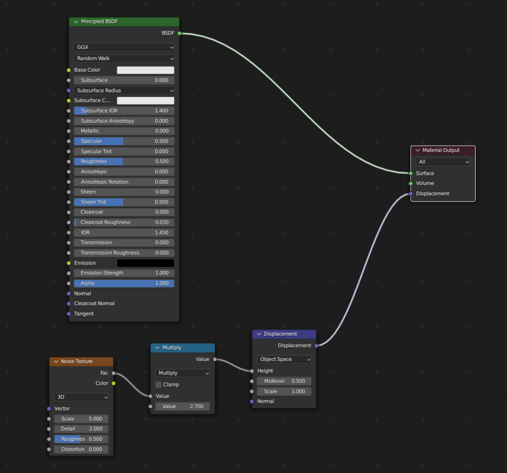 - Noise Texture: This creates the map that we will use to displace the model. If we had an actual displacement map, we could use the image texture instead of the noise texture.
