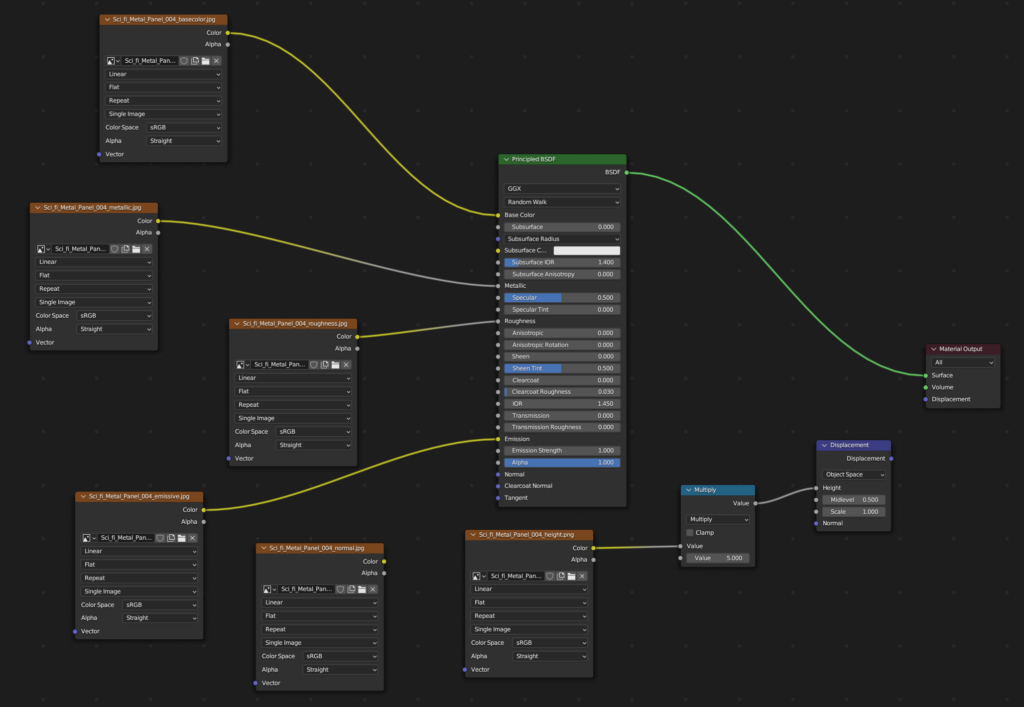 - Displacement: This node is the star of our nodes, handling the actual displacement. We will plug the other nodes into the height parameter to change the displacement of the model.
