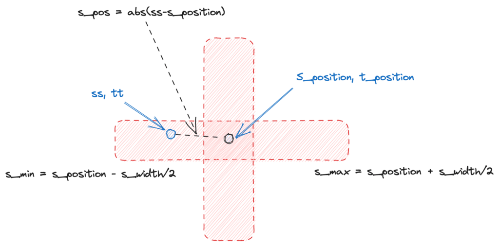 To create the cross shape, we create variables s_max and s_min. We then check whether ss is between these values. We also added s_pos to adjust the length of both the horizontal and vertical parts of the cross.