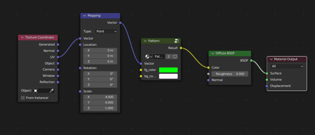 The nodes for this material are a little more complicated. To keep it simple, I created a node group. We use a mapping node into the pattern group and then the output into a diffuse BSDF.