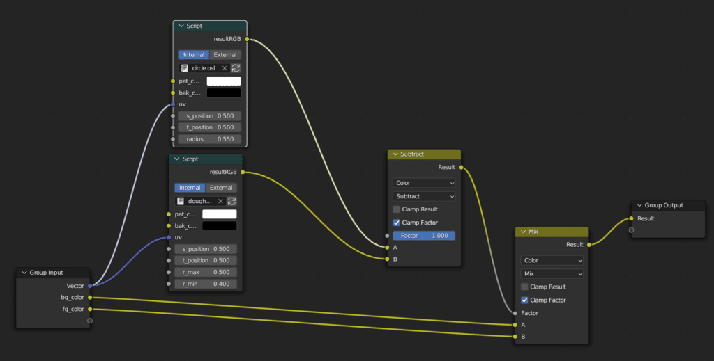 The pattern group nodes are below. We created three inputs into the group: vector (which we use for the UV vector) and two colors (background and foreground). Next, we use our two scripts. We set the colors to black and white, which makes the color math easier. We feed these into a subtract node (subtract the doughnuts from the circles). These are then used as the mix factor between the foreground and background colors.
