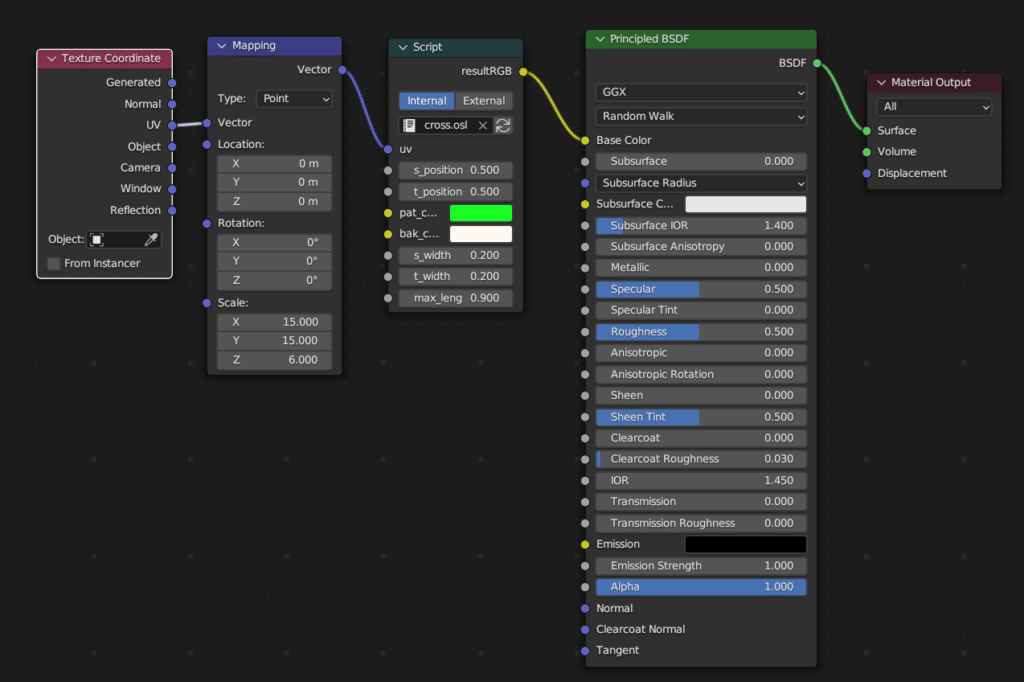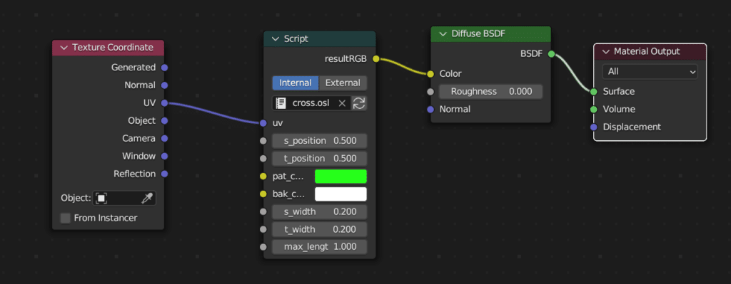 Here are the nodes. We plug a texture coordinate uv node into the script (all three work the same). The output from the script goes into a diffuse BSDF node.