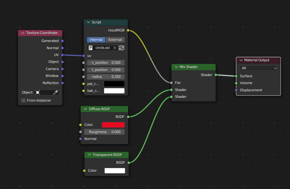 Below are the nodes. To create this, we add transparent BSDF and mix shader nodes. We then use the OSL script as an input to the mix factor.