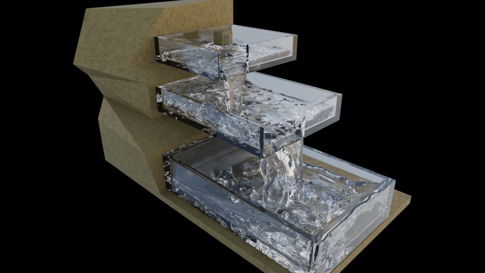 This process will require minor adjustments to get the right look. I had to modify the lengths of each box to ensure the water flowed properly across all three. You can increase the amount of water by increasing the inflow cube. If the bottom level is overflowing, you may need to increase the outflow cube. You may also have to increase the resolution of the simulation in the domain settings. However, this will increase the amount of time it takes to simulate and the size of the simulation file.
