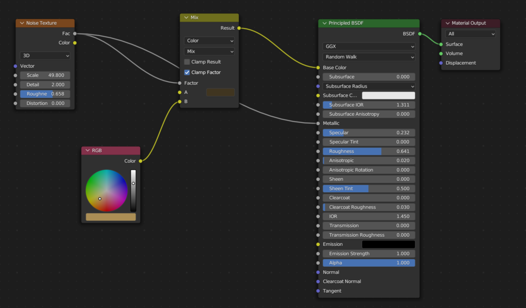 Now we will add the texture. Keep the principled BSDF and add a noise texture (shift + a, Texture->Noise Texture), RGB node (shift + a, Input->RGB), and a color mix node (shift + a, color->mix color).
