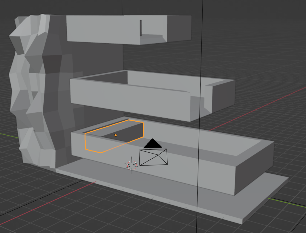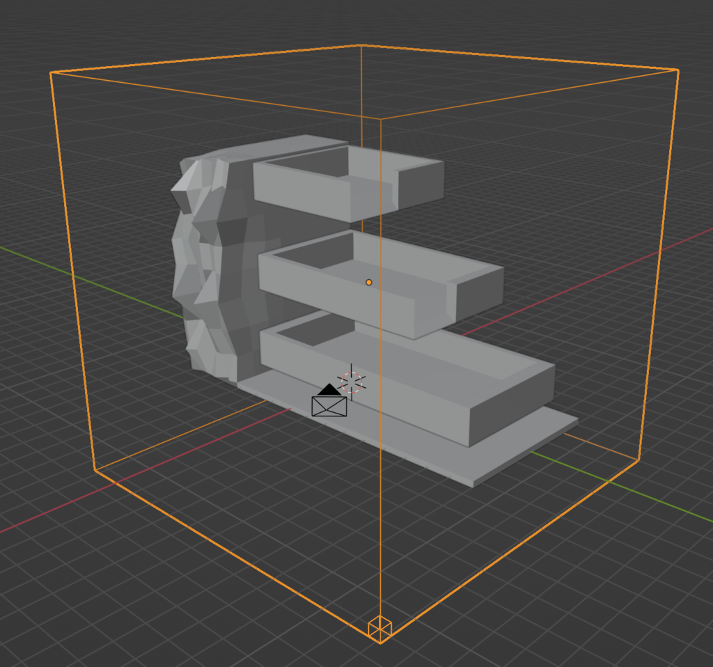 Next, we will make the base structure. I wanted to make something that looks rocky. Add a cube to the scene (shift+a, Mesh->Cube). Flatten to create the part that goes under the bottom box and scale in the X and Y directions to make it slightly larger than the box.
