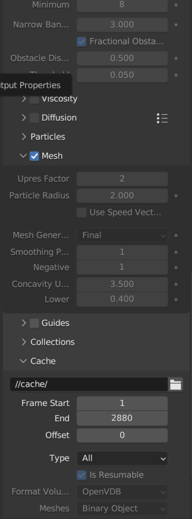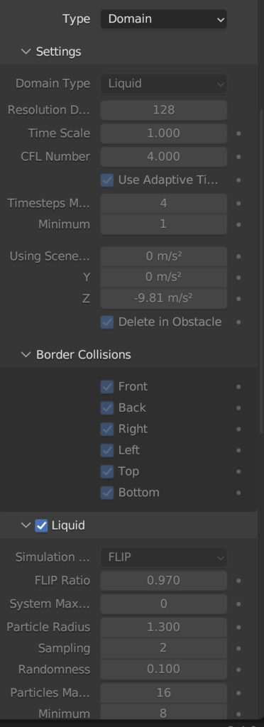 There are a few settings that we need to select. Change the Domain Type to Liquid and the Resolution to 64. For our final simulation, we will change it to at least 128, but for now, we want the simulation to calculate quickly. Scroll down and click the mesh checkbox and, in cache, change the type to All and click “Is Resumable”. This will allow us to pause the baking early and ensure that the results are as expected before we bake the whole simulation.