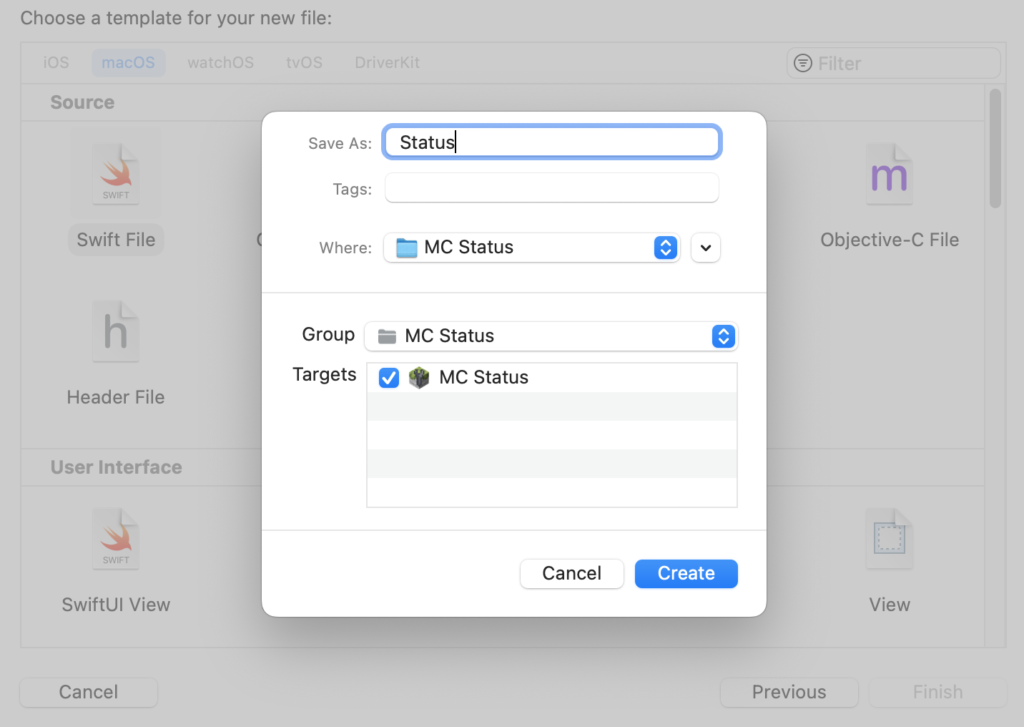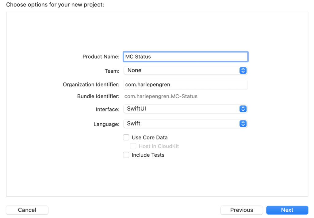 Choose a name for the app. In my case, I used MC Status. Ensure the interface is SwiftUI and the language is Swift.