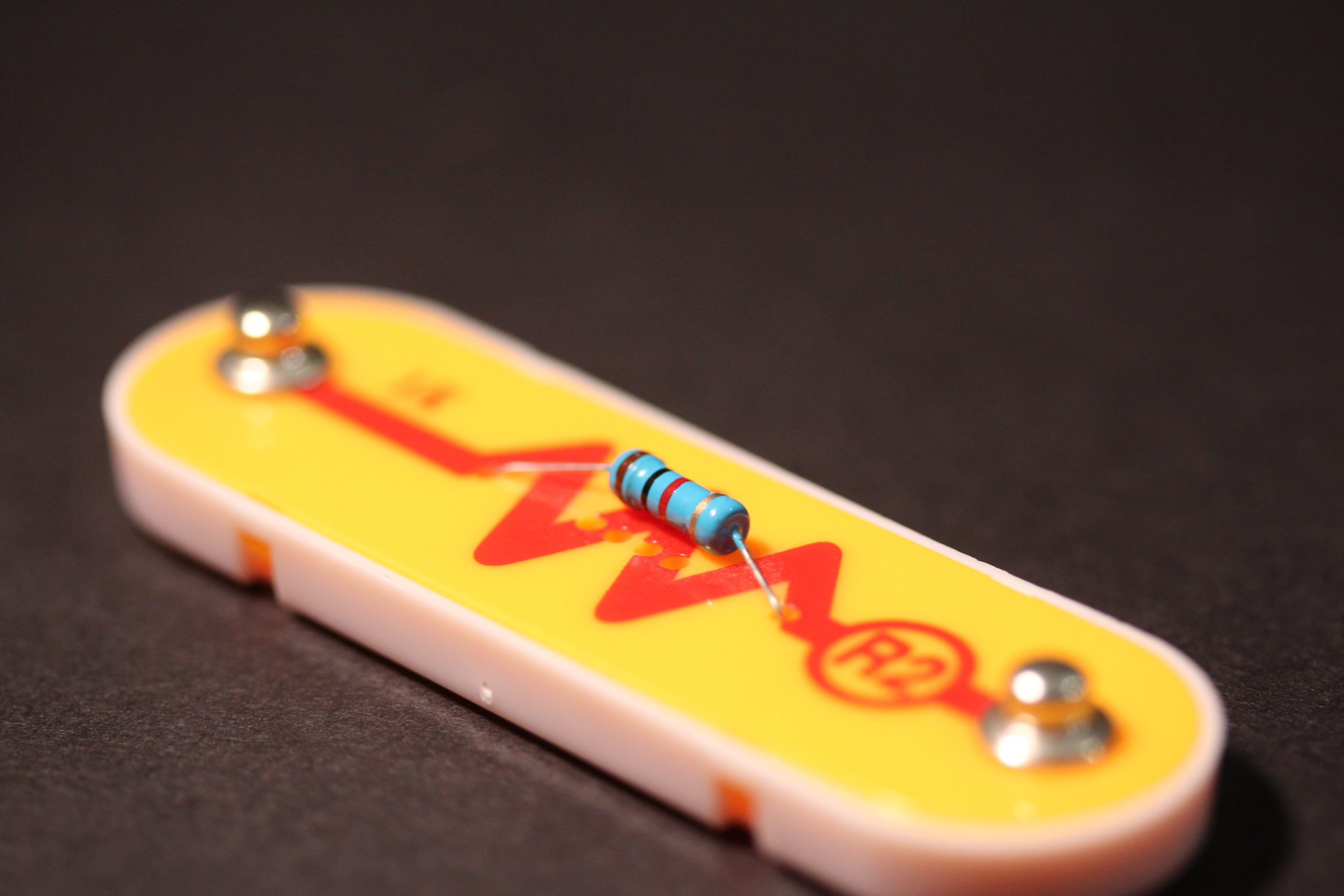 The next component that is critical to learn is the capacitor. The capacitor is like a very small battery. You can find a lot of explanations around the physics that make a capacitor work, but I really struggled to understand why you would use a capacitor (and how to actually use a capacitor). The charge held by the capacitor seemed too small to be useful. What was most confusing is that when a capacitor is fully charged, the current stops flowing through the capacitor. When I tried to use in Snap Circuits, it charged and discharged so quickly that I saw no effect. I was missing two key pieces of information. First, if you are using the capacitor as a battery, you need to place the capacitor in parallel instead of in series. That way, the electricity will still flow once the capacitor is charged. Second, you need resistance to slow the charge and discharge of the capacitor.