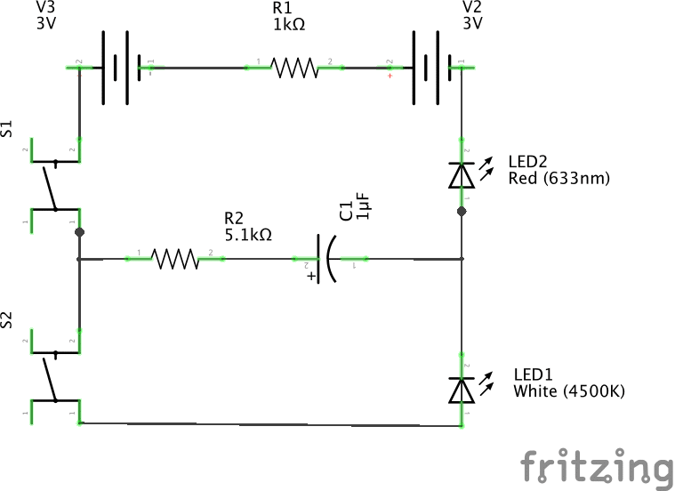 In this example, when switch S1 is turned on, current flows across R2 and the capacitor C1 until the capacitor is fully charged. LED2 will be lit while the capacitor is charging. Once the capacitor is charged, you can turn off S1 and turn on S2. This causes current to flow from the capacitor across LED1 until the capacitor is fully discharged.