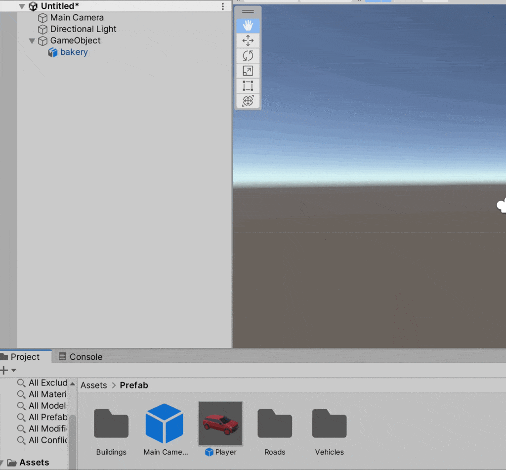 Next, I added a plane that the buildings will sit on (GameObject->3D Object->Plane).