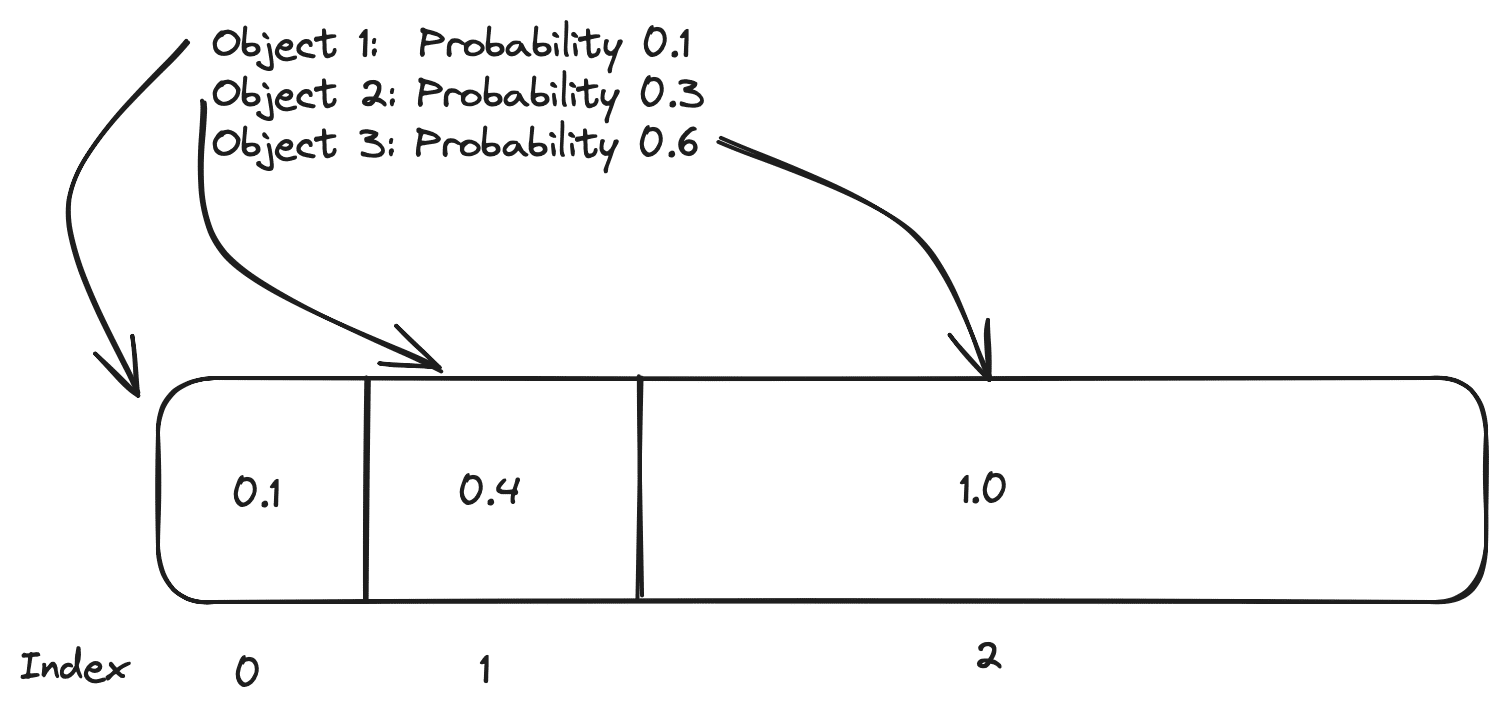 Vector3 spawnPoint = new Vector3(spawnX,spawnY,spawnZ);Next, we create a random number between 0 and 1 and store in spawnRandom. We will use this to pick the object we want to spawn. We then loop through our probabilities array until our current random number, spawnRandom, is greater than the number at the current index of the probabilities array (see the graphic in the Initialization section above).